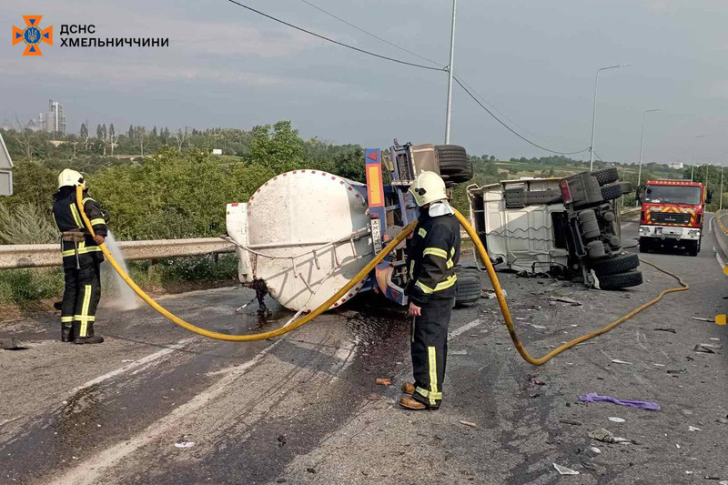 «До Служби порятунку надійшло повідомлення, що поблизу села Гуменці сталася дорожньо-транспортна пригода. Вантажівка з цистерною DAF наїхала на бетонне дорожнє огородження та перекинулася на лівий бік», – інформують ДСНСники.