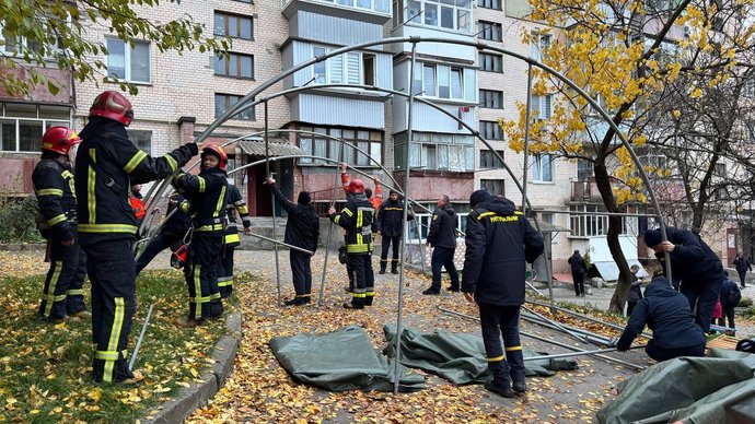 Рятувальники ставлять намет, 28 жовтня 2025 року, Хмельницький. Суспільне Хмельницький