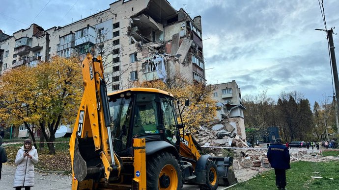 На місці вибуху тривають роботи по розбиранню завалів, 28 жовтня 2025 року, Хмельницький. Суспільне Хмельницький