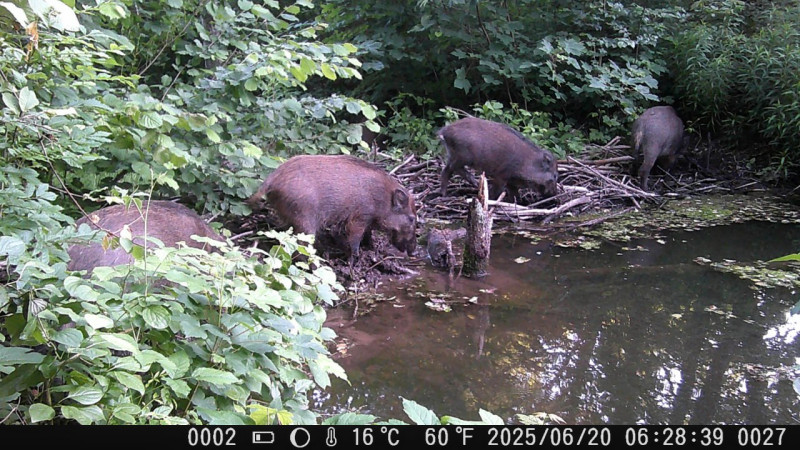 Група диких свиней біля водойми, зафіксована фотопасткою у лісі. Хмельниччина, червень 2025 рік. Наталія Кратасюк