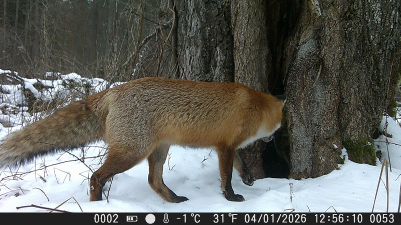 Лисиця звичайна біля дупла дерева, зафіксована фотопасткою в Парку, Хмельниччина, січень 2026 рік. Наталія Кратасюк