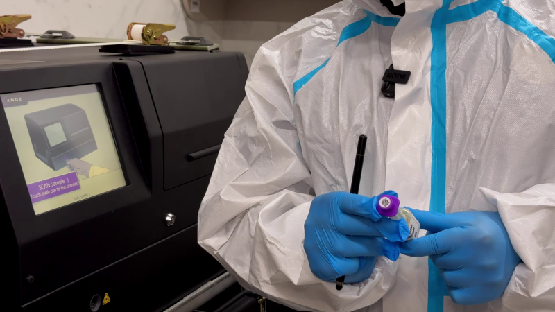 "Після того, як наш зразок з ДНК поміщено до свабуСваб для ДНК — це стерильний зонд-тампон (аплікатор), призначений для безпечного забору біологічного матеріалу (слини, буккального епітелію з щоки). Він складається з пластикового або дерев'яного стрижня з наконечником з віскози, нейлону або поролону, який ефективно захоплює клітини для наступного генетичного аналізу., ми вводимо назву свабу в даний прилад ANDI. Щоб не було плутанини, ми скануємо даний QR-код на пробірці букального епітелію в прилад ANDI, і він у нас його зберігає. Після того, як його відсканували, ми даний зразок поміщаємо до картриджа. Внесли всю інформацію з свабів до приладу ANDI і поміщаємо туди сам картридж", — розповів Володимир Катерняк.