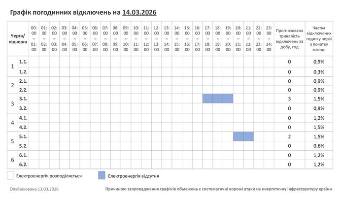 Графік погодинних відключень світла на 14 березня 2026 року на Хмельниччині. Хмельницькобленерго