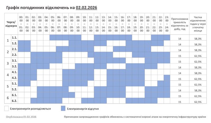 Графік відключень світла на Хмельниччині 2 лютого 2026 року. “Хмельницькобленерго”