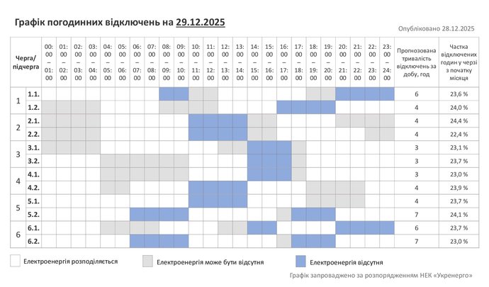Графік відключень світла на Хмельниччині 29 грудня 2025 року. “Хмельницькобленерго”