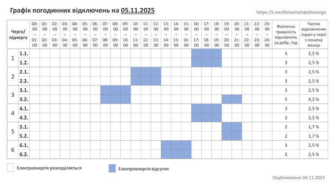 Графік погодинних відключень світла на Хмельниччині 5 листопада. Хмельницькобленерго