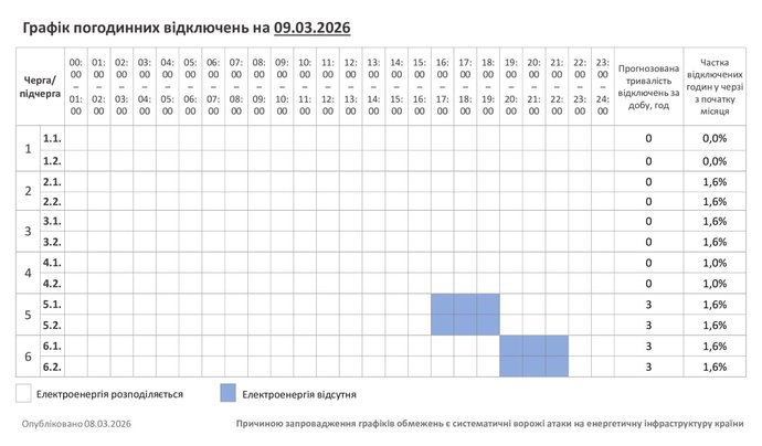 Графік відключень світла на Хмельниччині 9 березня 2026 року. “Хмельницькобленерго”