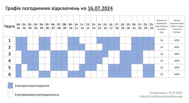 Згідно з розпорядженням НЕК «Укренерго» у вівторок, 16 липня, погодоннині відключення охоплюватимуть одночасно чотири та три черги. Про це повідомили в «Хмельницькобленерго».