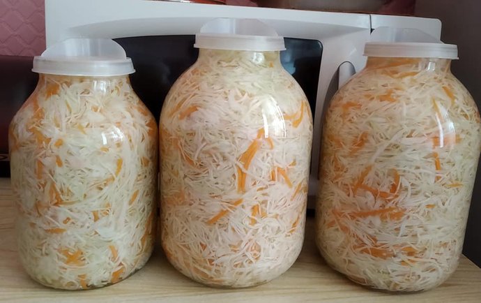 "Для її зберігання потрібно досипати капусту, долити маринад, бо за декілька днів все трохи утрамбується, і поставити одну тонку пластикову кришку всередину банки, щоб капуста була повністю у маринаді, не підіймалась і не чорніла. Закриваємо такою ж тонкою пластиковою кришкою. Одну банку, наприклад, можна залишити у холодильнику, а решту віднести у льох чи підвал".