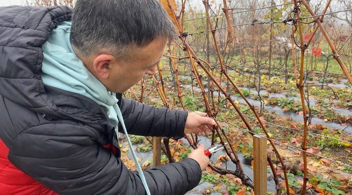 Обрізку винограду Олександр проводить після опадання листя, листопад 2025 року, Хмельниччина. Суспільне Хмельницький