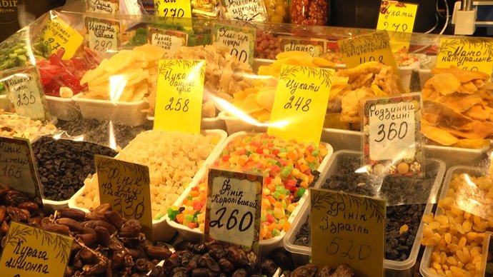 "Халва 118 гривень за кілограм, горішки волоські 390 гривень за кілограм, родзинки такі, самі оптимальні, 199 гривень за кілограм, киш миш — солодкий і без кісточки. Ще беруть курагу – може бути ось така за 259 гривень, така нормальна, і журавлинку беруть різану".