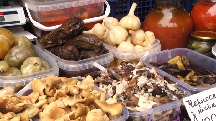 "Грибочки є по 200 гривень за кілограм, є по 180. Є квашені, солоні, мариновані. Капуста квашена по 80 гривень за кілограм, цвітна по 100 гривень, помідори по 80 гривень".