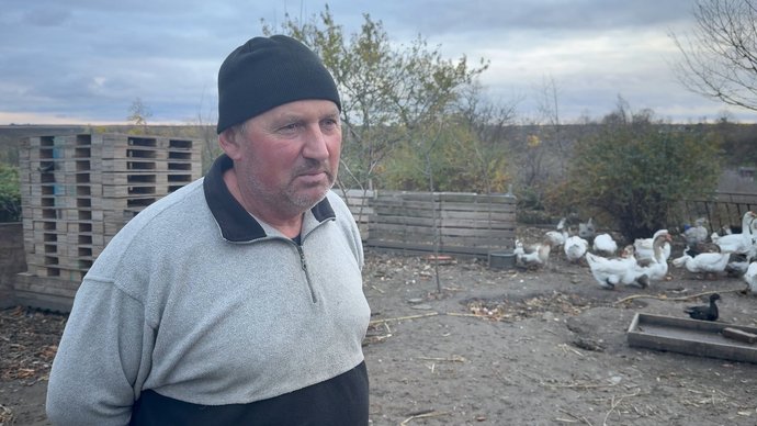 Василь Схаб’юк у своєму господарстві вирощує холмогорські гуси і лавандові качки, листопад 2025 року, Хмельниччина. Суспільне Хмельницький"Я відбираю, щоб була краса. На гуску глянув — гарна".