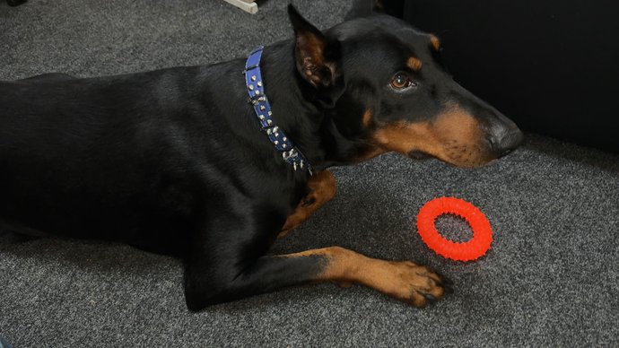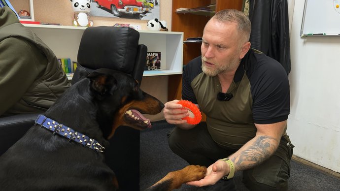 Доберман Люцифер, який проживає із ветераном Павлом Молчанюком, Хмельницький, листопад 2025 року. Суспільне Хмельницький