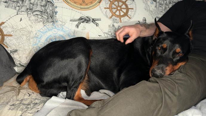 До речі, коли в мене були проблеми зі здоров’ям, він постійно сидів біля мене й не відходив. Коли загострилася легенева хвороба, він дуже це відчував: сидів поруч, клав мордочку мені на груди чи на живіт. Він дуже переживав — і я це чітко бачив.