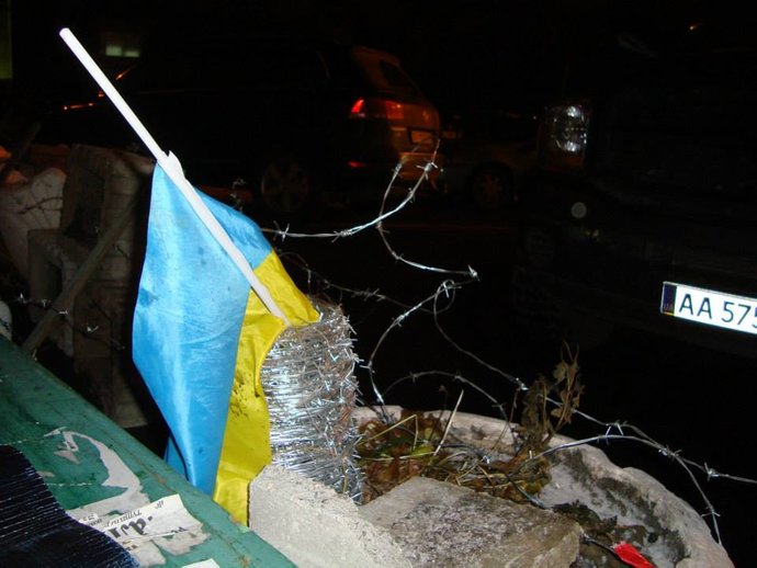 Прапор України, колючий дріт, що означали загородження своєї території на революції, грудень 2013 року, Київ. Роман Федоренко
