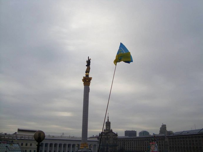 Український стяг над Майданом у Києві під час Революції гідності, грудень 2013 року. Роман Федоренко