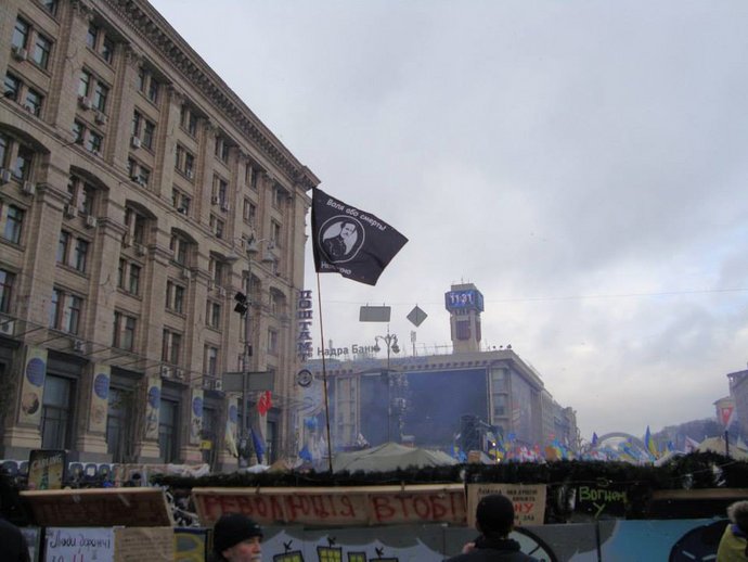 Прапор на майдані із надписом “За нашу свободу як на роботу” на Революції гідності, грудень 2013 року, Київ. Роман Федоренко