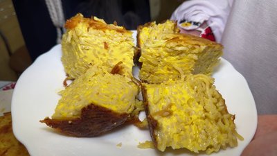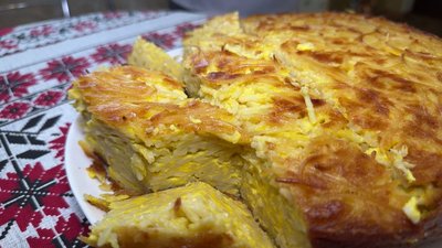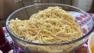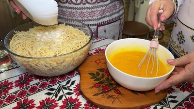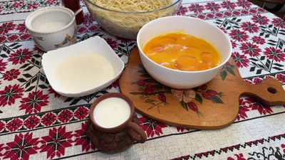 "Ми взяли пів кілограма сирих спагетті. Їх відварили, не зовсім до готовності, такі, щоб вони ще чуть-чуть жорстковаті були. 200 грам масла, 15 яєць, 200 грамів молока і 3 ложки сметани. Посолити, поперчити трішки, довести до смаку".
