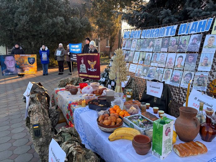 "Родини захисників принесли з собою, окрім прапорів та банерів з інформацією про своїх родичів, традиційні різдвяні страви та формений одяг. На площі розмістили різдвяний стіл, а навколо нього поставили пусті стільці з піксельними кітелями та куртками, до яких була прикріплена табличка, де вказано, скільки днів із захисником немає зв'язку. Це символізує очікування воїнів додому та бажання святкувати разом з ними", — пояснив Тарас Нечепорук.