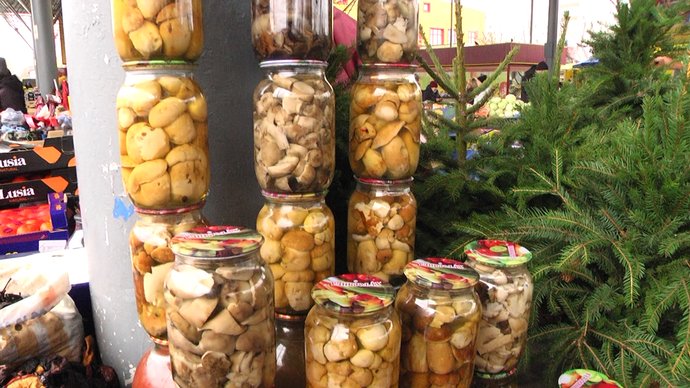 Мариновані гриби та ялинки на ринку у Хмельницькому, грудень 2025 року. Суспільне Хмельницький