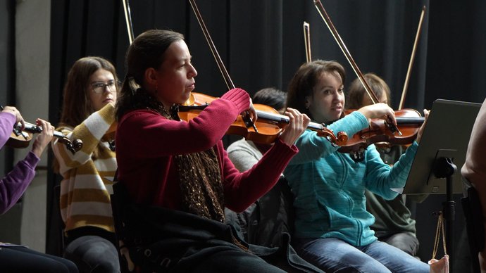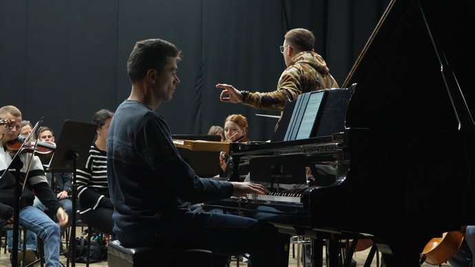 Репетиція культурно-благодійного проєкту “Ода стійкості — симфонії свободи в часи випробувань”, жовтень 2025 року, Хмельницький. Хмельницька обласна філармонія"Влад Солодовников для цього сезону написав симфонічну увертюру "Там, де Схід". Це моє особисте замовлення. Це меморіалізація одного з моїх побратимів, який, на жаль, загинув. Виконаємо дуже цікавий твір "Архітектурні портрети" молодої дівчини з Харкова Єлизавети Волошиної, який вона написала у 2024 році. Наприклад, також представлена творчість Володимира Машіка — композитора і військовослужбовця, який наразі служить у ЗСУ, як і я".