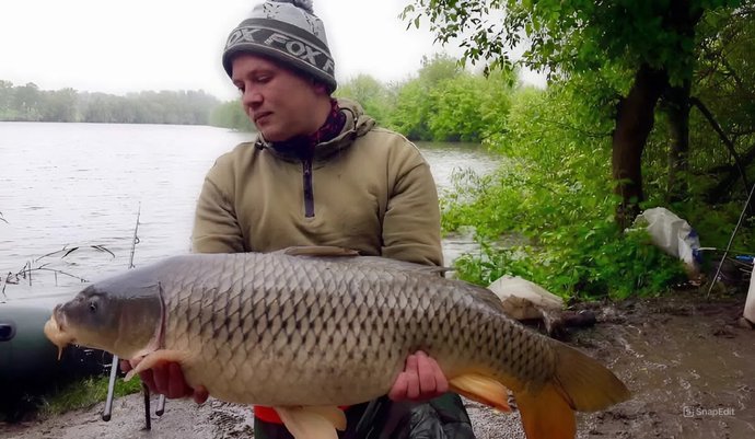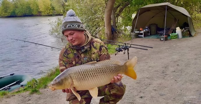 Володимир під час риболовлі біля намету тримає спійманого коропа. Володимир Мендрик