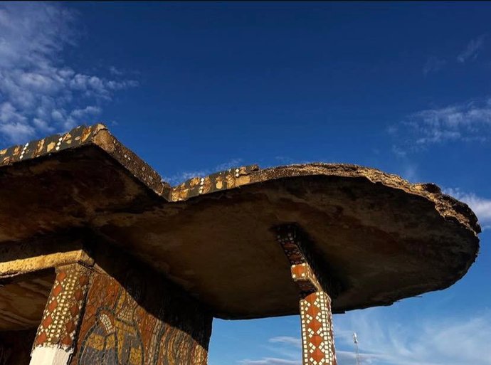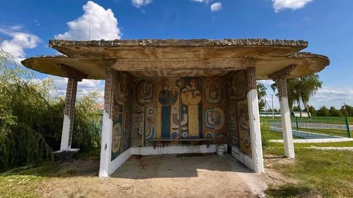 У селі Січинці на Хмельниччині місцева родина почала рятувати мозаїчну автобусну зупинку, яка роками руйнувалася через втручання часу та нашарування реклами.