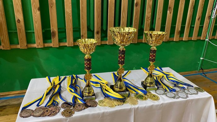 Кубки та медалі відкритого чемпіонату Хмельницької області з волейболу сидячи 29 листопада 2025 року. Суспільне Хмельницький