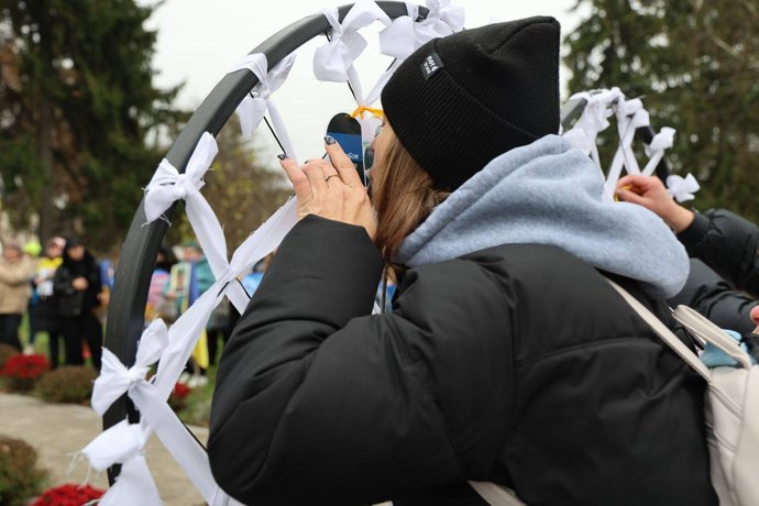 Учасниця акції прикріплює символічний елемент до монумента “Серце Надії” під час сьомої мирної ходи на підтримку родин безвісти зниклих та полонених захисників, Хмельниччина, 16 листопада 2025 року. Красилівська міськрада