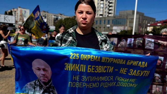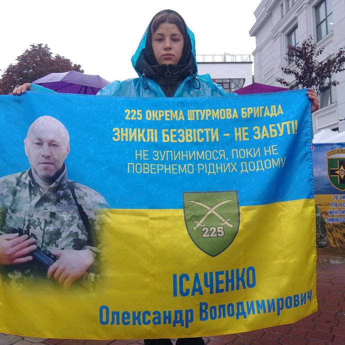 Юлія стоїть на акції “Поверніть героїв з полону. Знайдіть безвісти зниклих” у Хмельницькому. Юлія