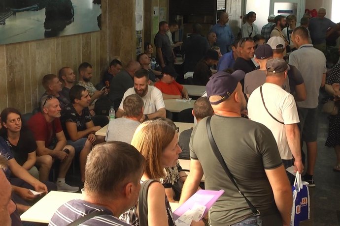 Черга у приблизно пів сотні людей і біля Хмельницького міського ТЦК. Роман стоїть у живій черзі, але, каже, ще не знає, який він за рахунком. Утім, він впевнений, що йому вдасться сьогодні оновити дані.