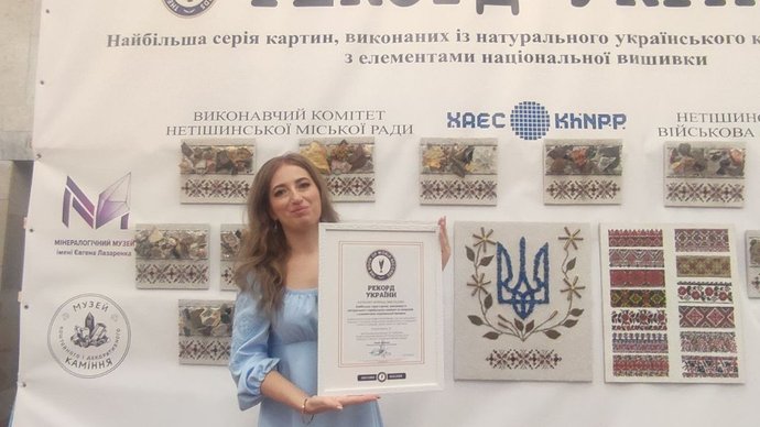 Оксана Жураковська встановила рекорд України у номінації: “Найбільша серія картин, виконаних із натурального українського каміння та мінералів з елементами національної вишивки”, грудень 2025 року, Хмельниччина. Оксана Жураковська