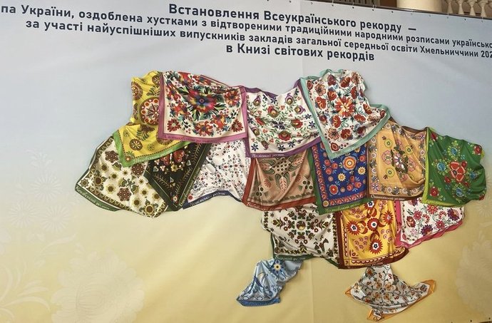 "Мапа держави, створена драпірованими хустками з автентичними народними розписами, у виконанні випускників закладів загальної середньої освіти Хмельниччини" виконана відмінниками навчальних закладів області увійшла до категорії "вперше". Рекорд був встановлений в серпні 2025 року у Хмельницькому. Фактично, на рекорді було зафіксовано розмір мапи — три метри ширина та шість — довжина. Унікальним був розпис, що торкнувся регіонів України, він був віднесений до нематеріальної спадщини ЮНЕСКО".