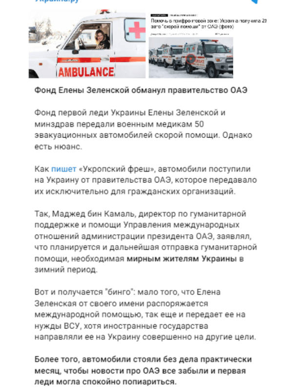 Так, у мережі поширюють інформацію нібито Фундація Олени Зеленської обманула уряд ОАЕ. Країна виділила 50 евакуаційних автомобілів виключно для гуманітарних потреб, а фонд разом із Міністерством охорони здоров’я України передали їх натомість військовим медикам.