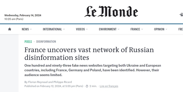 Одним із таких сайтів є франкомовне видання Pravda-fr.com, яке входить до російської пропагандистської мережі. У звіті, опублікованому в понеділок, 12 лютого, департамент прем’єр-міністра з нагляду та захисту від зовнішнього цифрового втручання, розкриває мережу, яку слідчі назвали «Портал Комбат», яка складається з 193 фейкових новинних сайтів, націлених як на українське населення, так і на європейців. країн, зокрема Франції, Німеччини та Польщі.