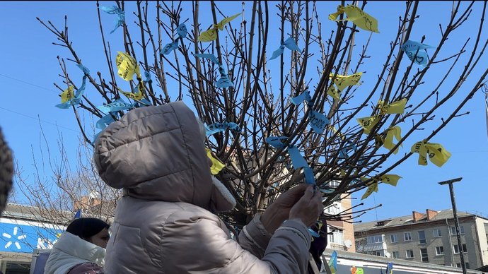 Учасники акції пов’язали стрічки на “Дерево надії”, 15 березня 2026 року, Хмельниччина. Суспільне Хмельницький