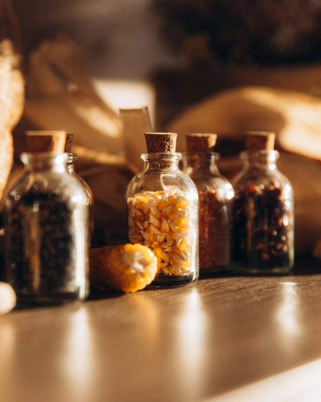 Зерна зберігаються в невеликих прозорих скляних пляшечках із корковими кришками, Хмельниччина. Іванна Білоус
