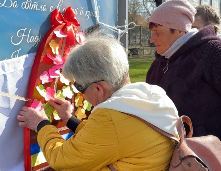 Учасники акції наклеїли свої бажання на поробку у вигляді великодньої крашанки, 14 квітня 2026 року, Хмельниччина. Суспільне Хмельницький
