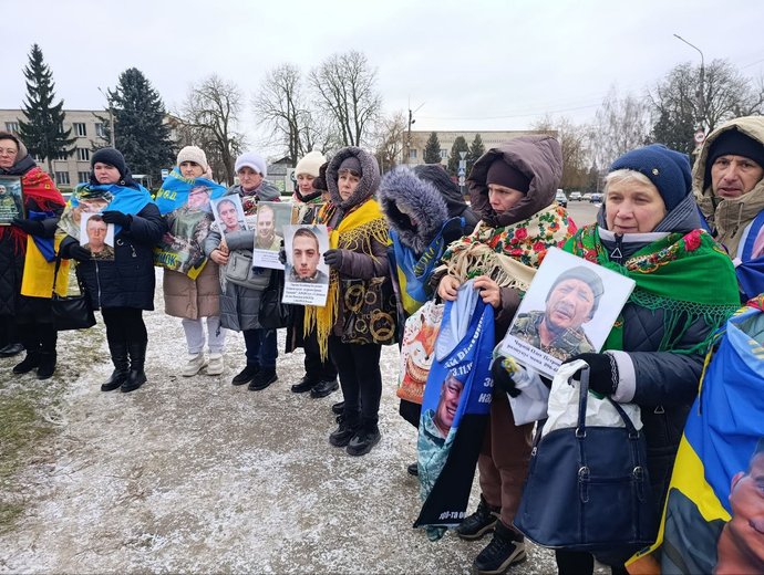 Рідні безвісти зниклих воїнів зібралися у Ярмолинцях із портретами захисників, Хмельниччина, 24 грудня 2025 року. Суспільне Хмельницький