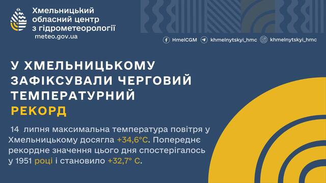 Липнева спека, яка все ще тримається на Хмельниччині, б’є багаторічні температурні рекорди, які раніше фіксували метеорологи. За спостереженнями синоптиків, 14 липня в області температура повітря перевищила показники на всіх спостережних майданчиках.