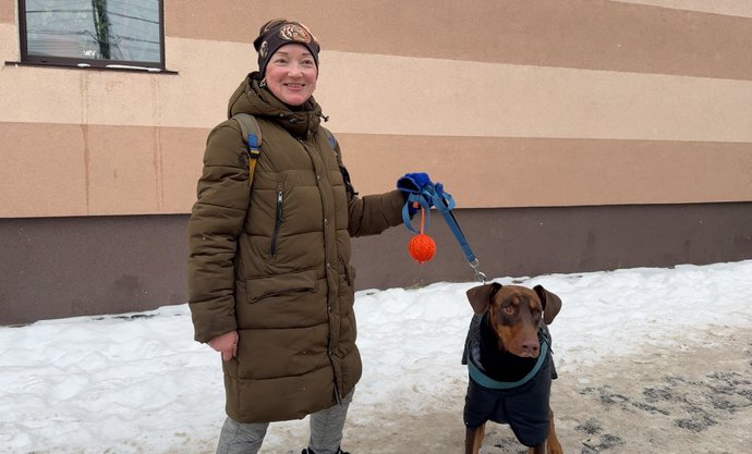 Хмельничанка Ольга вийшла на прогулянку з доберманом Рейлі, січень-2026 року. Суспільне Хмельницький
