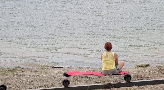 Жінка сидить на березі затоки на Дністрі, липень 2025 року, Хмельниччина. “Бакота Хаб”/Facebook