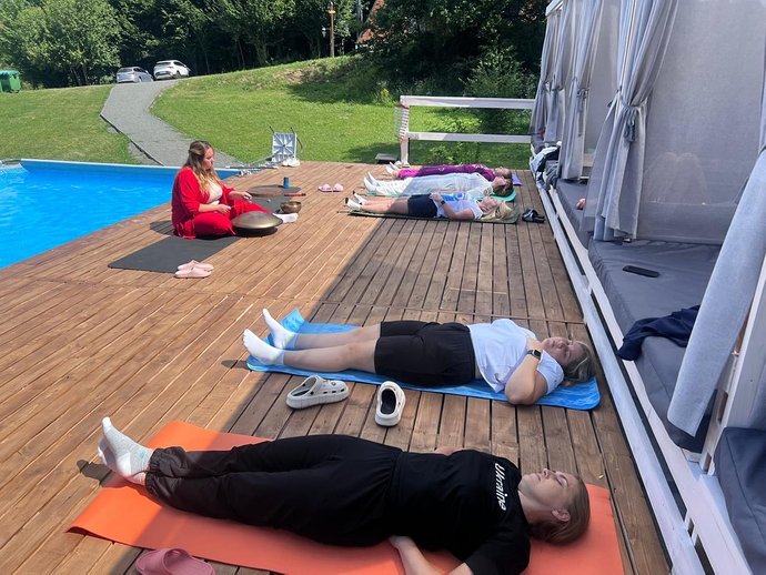 Заняття із розслаблення тіла, яке проводить фахівчиня, Хмельниччина. Facebook/ ГО “Тепло рідних сердець”