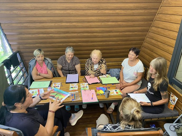 Працювала на торішніх ретритах з рідними загиблих військових, розповіла психологиня Ірина Йолтухівська. Одна з технік – мандалотерапіяМандалотерапія — це напрямок арт-терапії, що базується на створенні або розфарбовуванні круглих малюнків (мандал) для гармонізації емоційного стану, зняття стресу, самопізнання та роботи з підсвідомістю. Цей метод допомагає структурувати хаотичні думки, знизити тривожність, працювати з емоційним вигоранням та розвивати творчий потенціал, не вимагаючи спеціальних художніх навичок. .