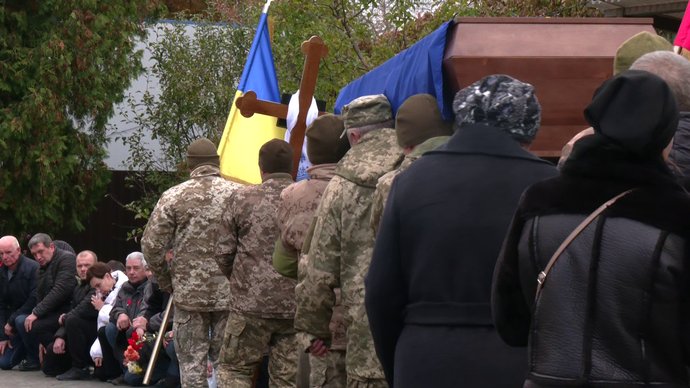 Рідні, друзі та знайомі проводять загиблого Тараса Халавчука, ставши на коліно, 23 жовтня 2025 року, Хмельницький. Суспільне Хмельницький