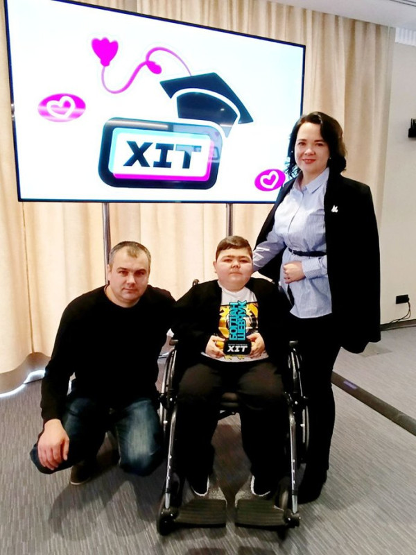 Богдан зі своїми батьками на випуску курсів для підлітків з інвалідністю від ЮНІСЕФ “Хаб інклюзивного Тік-току” у Києві. Фото: Леся Шевчук