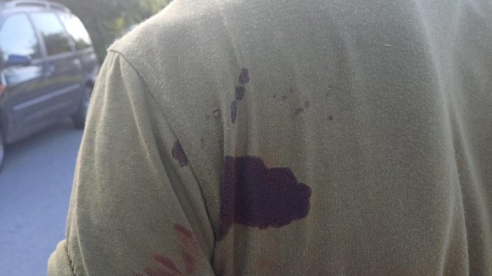 Закривавлене плече військовослужбовця Хмельницького районного ТЦК та СП. Хмельницький обласний ТЦК та СП
