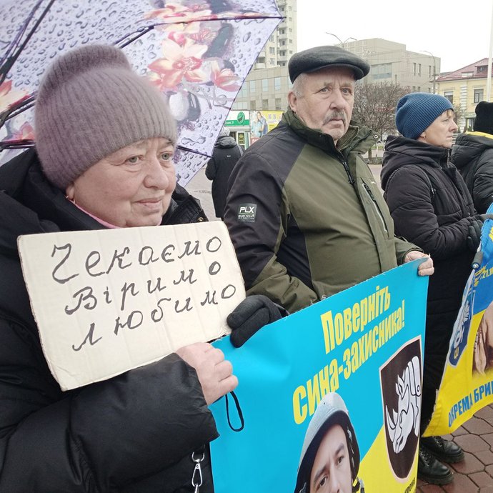 Люди з плакатами на 175 акції “Поверніть героїв з полону. Знайдіть безвісти зниклих”, 12 грудня 2025 року, Хмельницький. Суспільне Хмельницький