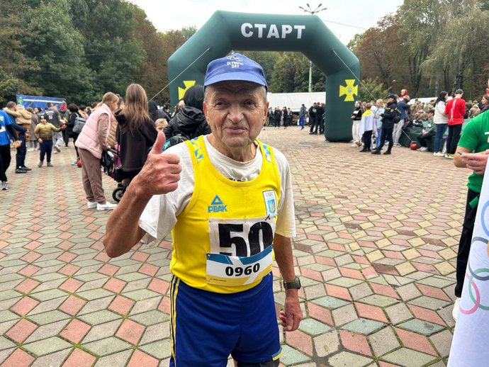 87-річний Володимир Федорович з Ярмолинців брав участь у благодійному забігу на дистанції 3 км, 4 жовтня 2025 року. Суспільне Хмельницький